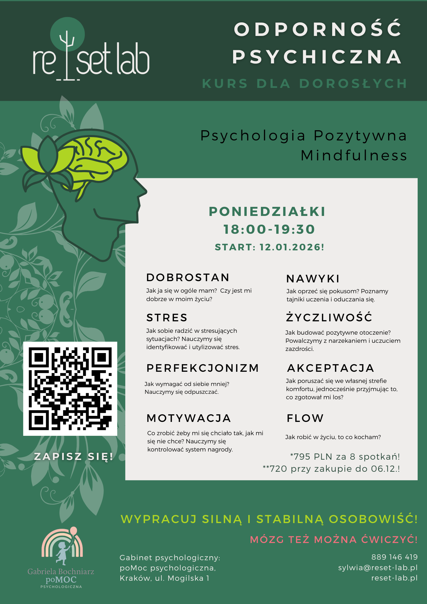 O kursie: To zaproszenie do spotkania z samym sobą – w atmosferze ciepła, życzliwości i uważności.Podczas 8 spotkań nauczysz się, jak skutecznie radzić sobie ze stresem, wzmacniać swoją motywację i budować psychiczny dobrostan w codziennym życiu.